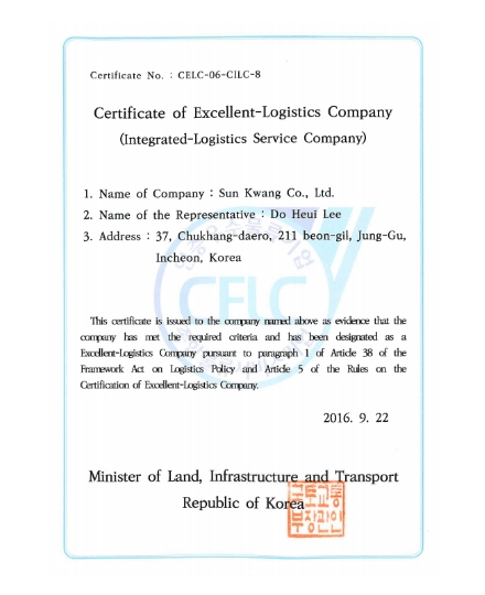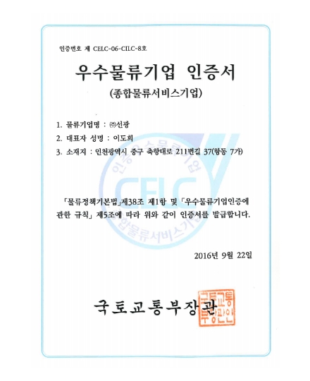 • 우수물류기업 인증서
